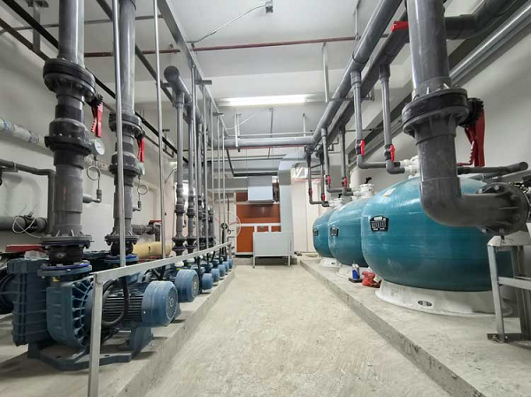 由“杀菌-投药-监测”构成的泳池水质处理系统,实现了水质净化的全流程管控。其中,中压紫外线杀菌器采用纯物理消毒方式,可快速破坏细菌、病毒、藻类等各类微生物的DNA结构,杀菌率高达99.9%;而作为水质调节“精准管家”的投药泵,有效攻克了传统人工投药剂量不均、操作繁琐的行业痛点,可根据水质实时需求稳定输送药剂;被誉为“实时哨兵”的水质监控仪,则能全天候监测水中余氯、pH值等关键指标,将原本不可见的水质变化转化为可视化数据,既提升了水质管理的科学性与精准度,又大幅降低了人工巡检和干预的工作强度。