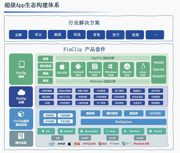 FinClip超级应用智能平台,是国内首个企业级小程序生态产品,已经在银行、证券、政企、电商、航空、园区、零售、教育等多个行业落地,为数百家企业用户提供先进的小程序全流程生态方案。