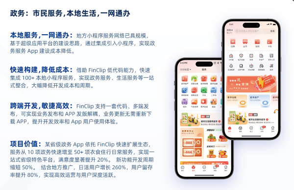 在某地区政务APP的实践中,通过引入FinClip小程序生态,服务板块从10项扩展至50余项,用户无需频繁更新APP,月均更新次数减少80%,满意度提升20%,开发成本降低70%,新功能上线周期缩短50%,日活用户增长260%,留存率提升80%。某制造业集团通过统一移动办公门户,实现微应用模块化管理,旧版报销应用仅用1-2天即完成小程序化改造,体验提升30%。