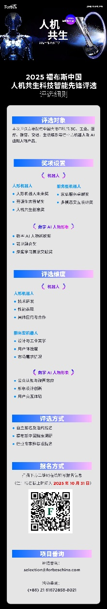 目前,“2025 福布斯中国人机共生科技智能先锋评选”报名正式开放,欢迎相关企业与个人积极参与。
