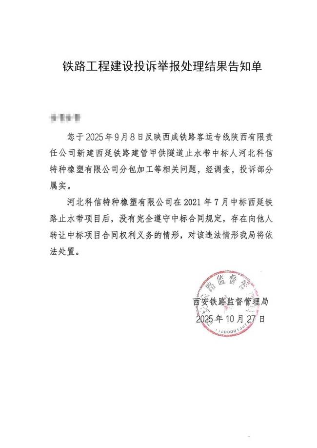 2025年8月,多家媒体平台发布河北科信在国家重点铁路项目止水带招标中的异常情况,指出其中标后违规分包行为存疑。同年9月8日,同行业企业的举报促使西安铁路监督管理局正式介入调查。2025年10月27 日,该局出具的《铁路工程建设投诉举报处理结果告知单》明确,投诉问题部分属实——河北科信于 2021年7月中标西延铁路止水带项目后,未完全遵守中标合同规定,存在向他人转让中标项目合同权利义务的情形,该局表示将依法处置该违法情形。