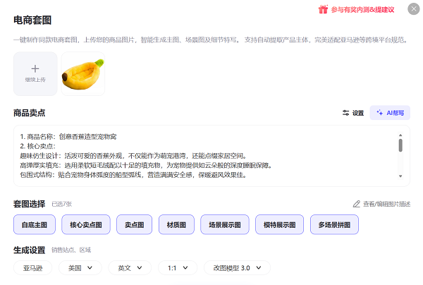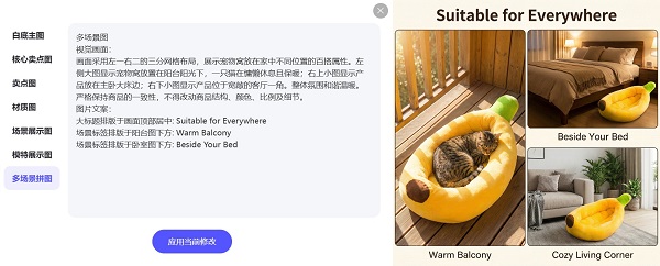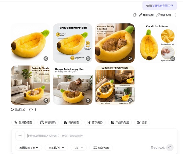 以一款“创意香蕉造型宠物窝”为例,系统在识别商品后,自动提炼出“趣味仿生设计”“高弹厚实填充”“包围式结构”等核心卖点,并结合适用人群与期望场景,生成多张不同用途的商品图。用户无需进行复杂的后期处理,即可获得一套适配多市场、多平台的系列视觉素材。