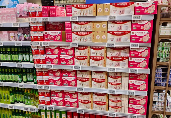 在成都多家大型商超,驱蚊杀虫类产品也已集中上架。超市店员介绍,电蚊香液、传统盘式蚊香的销量最为突出,是市民选购的主流品类。
