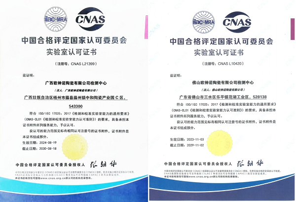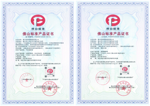 欧神诺执行严于国家及欧盟要求的产品内控标准,通过ISO14001、ISO9001等权威认证,并在2021年成为首批通过“佛山标准”认证的企业之一。2025年,欧神诺率先通过5A新国标检测,送检产品在吸水率、防滑性、耐污持久度、抗化学腐蚀等关键指标上,均达到新国标最高等级要求。