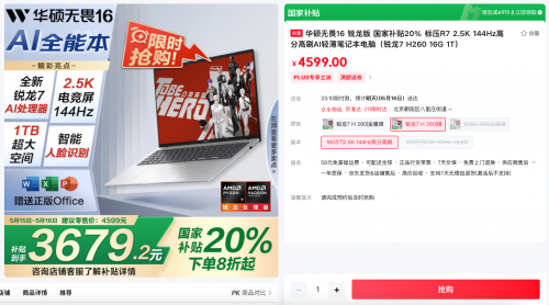 618大促正是焕新笔电的好时机。对于年轻人而言,轻薄度、性能和价格是他们购买笔电的三大核心考量因素。在众多型号中,高质价比首推华硕无畏16 2025,轻薄机身搭载AMD锐龙7 H 260移动处理器、2.5K 144Hz亮彩电竞好屏等配置,既能助你轻松完成论文撰写等学业任务,还能助你纵享休闲娱乐时光。当前购机,部分地区用户至高可领20%国家补贴,到手仅3679元,尤其适合大学生、职场新人等群体入手。