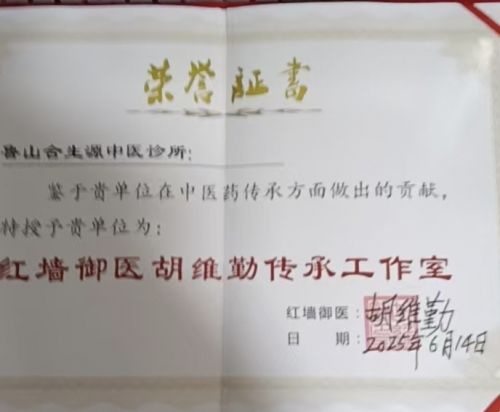沙河涓涓,见证了一位老中医的半世纪坚守。1953年3月出生的毕和生,在鲁山这片中医药底蕴深厚的土地上,将七十一载光阴熬成了一剂“专治胃脘痛”的良方。2023年4月13日,一本《中医执业证书》,将他与“内服方药”正式缔约;而“红墙御医胡维勤传承工作室”的铜牌,则如一味引经药,将民间经验与御医智慧交融升华。