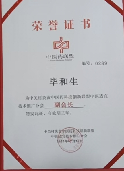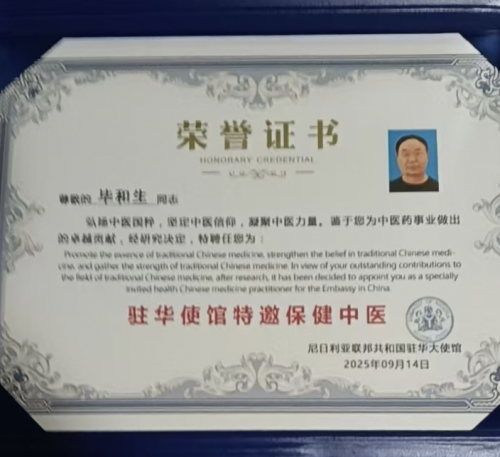在传承与创新的交汇处,毕和生从未停下脚步。他将御医传承的“养胃方”改良,更适合现代人的体质;他整理自己多年的诊疗案例,免费分享给基层年轻中医;诊所墙上,“中关村炎黄中医药科技创新联盟副会长”的证书与“中国中医药信息学会理事”的聘书相映成辉,而“尼日利亚联邦共和国驻华大使馆特邀保健中医”的荣誉,更让鲁山小镇的中医智慧,悄然走向了世界舞台。