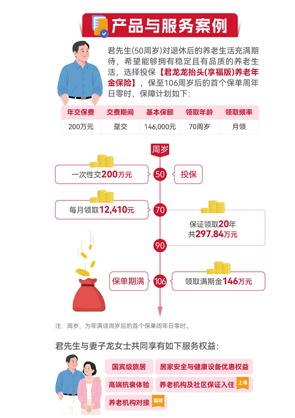 2024年,中国人民银行联合九部门联合印发《关于金融支持中国式养老业服务银发经济高质量发展的指导意见》中明确指出鼓励金融机构创新金融产品,为不同阶段、不同特征老龄群体提供全方位金融服务。2025年《上海养老金融服务银发经济高质量发展工作方案》也提出,支持在沪金融机构将机构养老、社区养老以及个性化养老服务纳入金融产品的权益或增值服务内容。这其中,保险有着天然的优势:在长寿时代背景下,通过商业保险实现长期稳健的财富储备,而财富的出口需要对接优质服务,才能满足家庭养老解决方案的真正闭环。