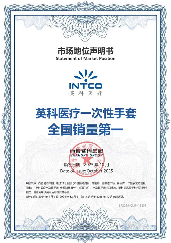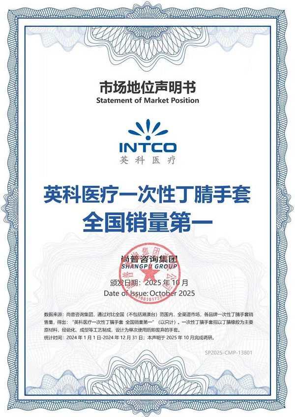 近日,基于尚普咨询集团2025年10月发布的权威调研数据,英科医疗在一次性手套与一次性丁腈手套领域均获评“全国销量第一”认证,再次印证了该公司在一次性防护用品领域的市场领导地位。