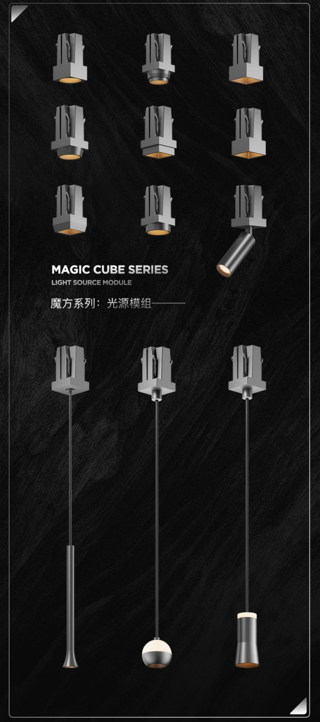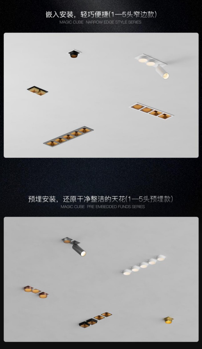 特别值得关注的是,MINI魔方系列创新性地采用了卡扣式卡扣结构与精密电子弹簧针的组合设计。这一设计让灯具安装过程变得简单顺滑、高效省力,更实现了光源切换的自由随心,为后期光源模组的更换与灯具维护提供了极大便利。同时,该设计还赋予了设计师卓越的自由度与空间创造力,真正做到了实用与便捷兼具。