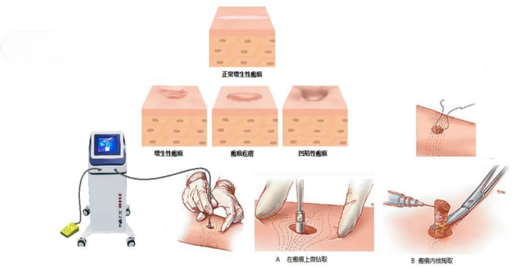 该技术的原理是通过核雕针切割组织至皮下脂肪层并切除瘢痕,在瘢痕组织内进行打孔、松解、抬高,去除瘢痕内核。经安全风险评估,这种治疗方式无热损伤、无光能辐射损伤,能精准切除深部瘢痕,创伤小,让患者在舒适的过程中接受治疗。