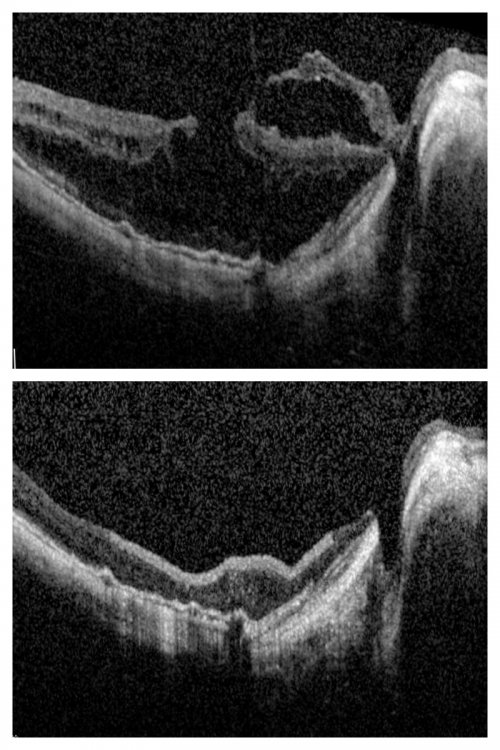 今年,王女士右眼视力明显下降,严重影响生活,带着对谷威院长的信任,她再次到北京爱尔英智眼科医院就诊。经详细检查发现,王女士右眼出现了黄斑裂孔、视网膜劈裂症、后巩膜葡萄肿等新的眼部问题,眼部情况十分复杂。