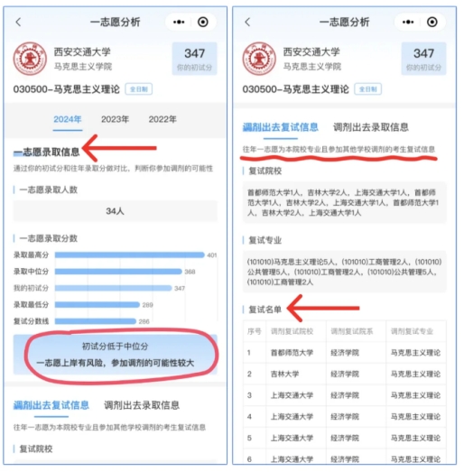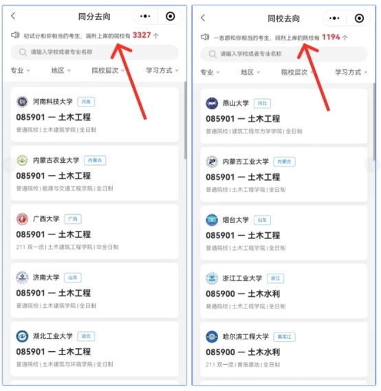 一方面,它会将你的初试分数与往年一志愿录取分数做对比,直观呈现你一志愿上岸的可能性 —— 如果分数远超往年录取中位分,可安心准备一志愿复试;若分数处于 “危险边缘”,则会提醒你提前启动调剂准备,避免错失机会。另一方面,它能帮你找到和一志愿相同的学长学姐,清晰展示他们调剂复试、调剂录取的院校专业。这些经过真实验证的 “调剂去向”,都是你后续调剂的重点参考目标,比盲目搜索的信息更具参考价值。