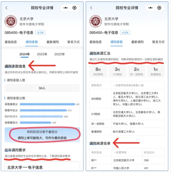 同分去向:精准定位与你初试分数相当的学长学姐,展示他们成功调剂上岸的院校专业,帮你找到 “分数适配” 的目标,降低调剂风险;