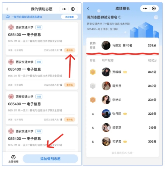 二是调剂志愿排名:当你选定意向院校专业作为调剂志愿后,可开通消息提醒,系统会实时推送该院校调剂信息的更新动态;更关键的是,它支持查看你在该调剂志愿中的成绩排名,以及其他考生的分数情况。通过排名对比,你能更清晰地判断自己的竞争力,进一步评估调剂上岸概率,让填报决策更理性。