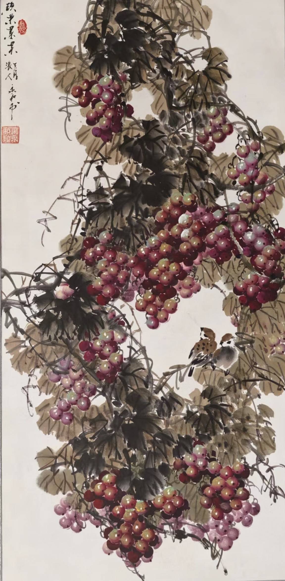 在题材选择上,《硕果累累》延续了中国传统花鸟画中“硕果”的吉祥寓意,葡萄象征着“多子多福”“丰收富足”,这种传统意象的选择,让作品具有深厚的文化根基。但梁永和并未局限于传统的寓意表达,而是赋予其当代内涵——在全球化时代,“硕果”不仅象征着物质的丰收,更象征着文化的繁荣与交流的成果。这种对传统意象的当代解读,让《硕果累累》具有了更广泛的文化意义,也体现了梁永和对时代议题的深刻把握。