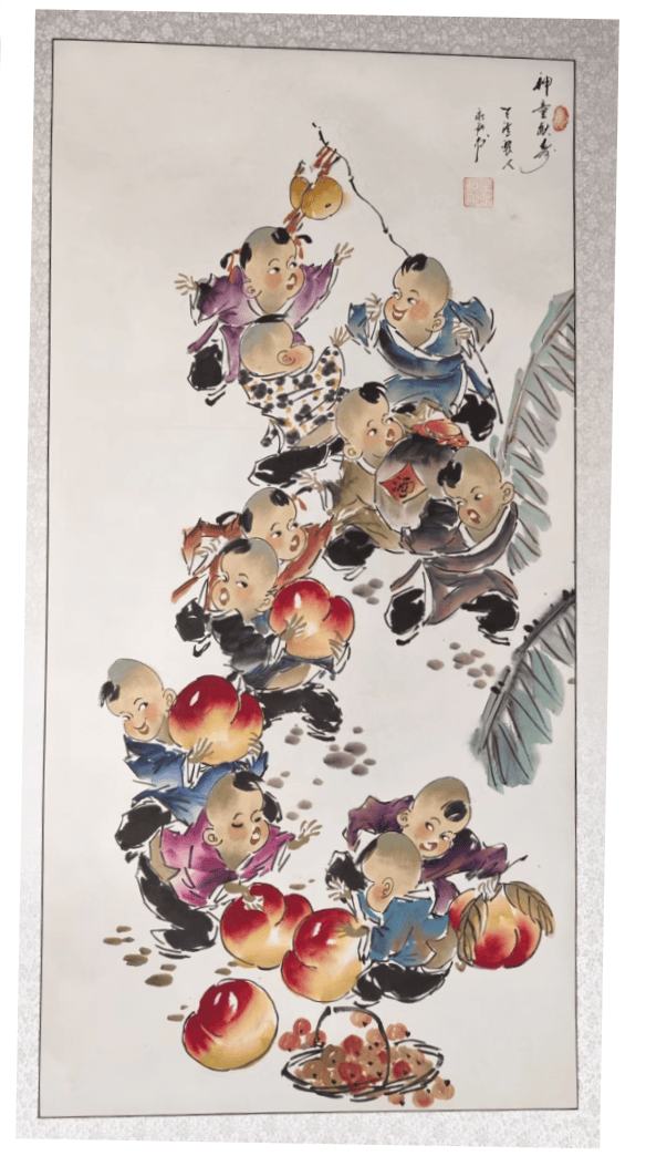 《童趣》是梁永和写意人物画的代表作之一,以儿童为主题,展现了他对生活的热爱与对纯真的追求。作品中,儿童形象天真烂漫,动作夸张生动,笔墨简练却传神,尽显梁永和写意人物画的功底。在情感表达上,《童趣》传递出对童年纯真的怀念与对生命本真的赞美,这种情感表达让作品具有强烈的感染力,也体现了梁永和对人性美好的追求。
