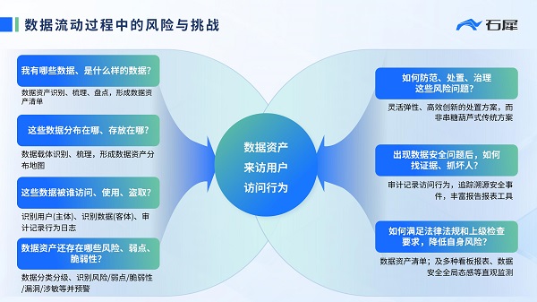 石犀科技在分享中强调,数据作为新型生产要素,其价值只有在流动中才能被充分释放。然而,传统安全思路常将“流动”与“管控”置于对立面,导致组织在效率与安全间艰难取舍。对此,石犀科技主张,治理的核心在于精准的协同而非妥协,通过对“数据资产”“来访用户”“访问行为”三大要素的精准识别与把控,构建一个既保障安全又不失效率的数据流动治理框架。