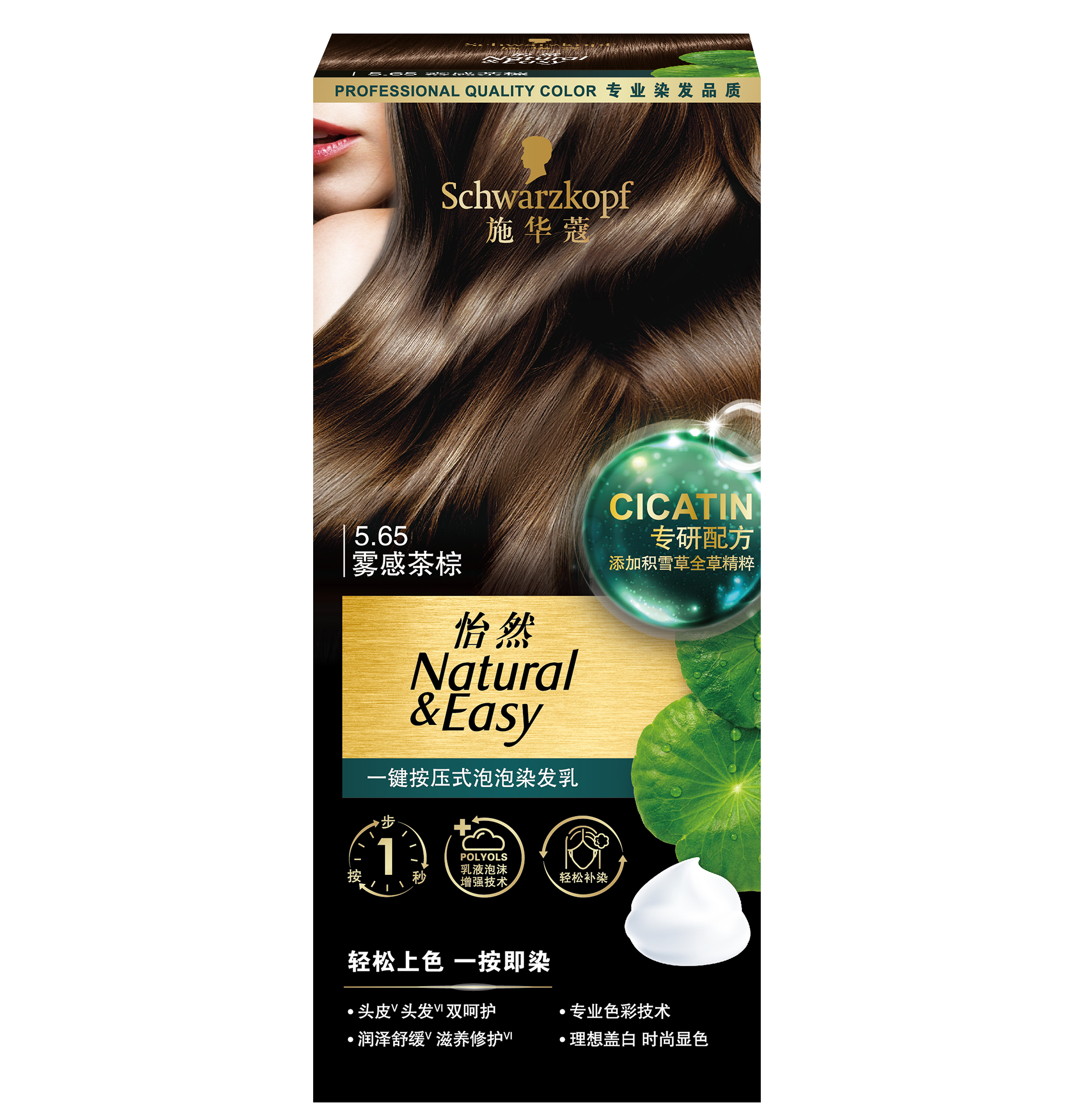温暖冬日离不开造型的点缀,精致型格,无需特定场合。施华蔻怡然一键按压式泡泡染发乳采用施华蔻创新气雾染发科技,“会按就会染”,在高效上色、修护发丝与使用便携度间找到平衡点。特配热门舒缓成分积雪草精粹等9重植粹,染发予你更温和的头皮发丝双呵护。真空气雾剂设计无须混合,高能密闭仓设计,随时补染如初。1按即染,4倍显色,6倍呵护。5.65雾感茶棕色调低调雅致,呈现自然透亮的棕色质感,为秀发增添柔和气韵。