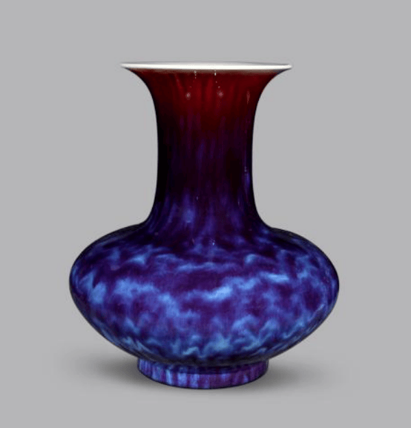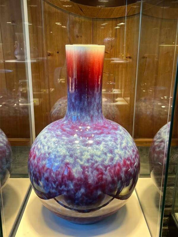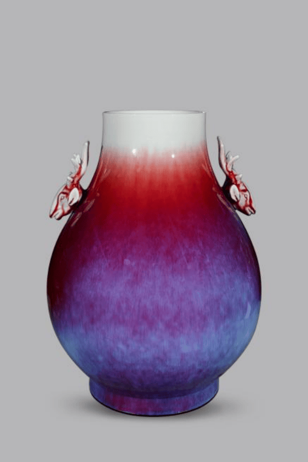 这件以鹿为灵感的尊器,以鸿运当头为主要创作意象。何华高独创性地将郎窑红的浓烈奔放与玫瑰紫的温润高雅熔铸一体,窑红和玫瑰紫的结合,在1320℃高温中催生出"姹紫嫣红"的釉色奇观。红色釉层搭配紫色渐变,釉面自然流淌形成的冰裂纹理。两者相互融合,既有热烈的红色奔放,又有紫色的典雅温和,形成了视觉上的和谐统一,使作品在色彩层次上更加丰富和立体。鹿角以浮雕技法雕琢,枝桠间流转的釉彩赋予其琥珀般的通透感,而鹿首低垂的姿态,则暗合"福鹿衔祥"的传统意象传递了吉祥、长寿、安宁与祝福的文化内涵,将器物从单纯的造型艺术升华为承载文化记忆的载体。