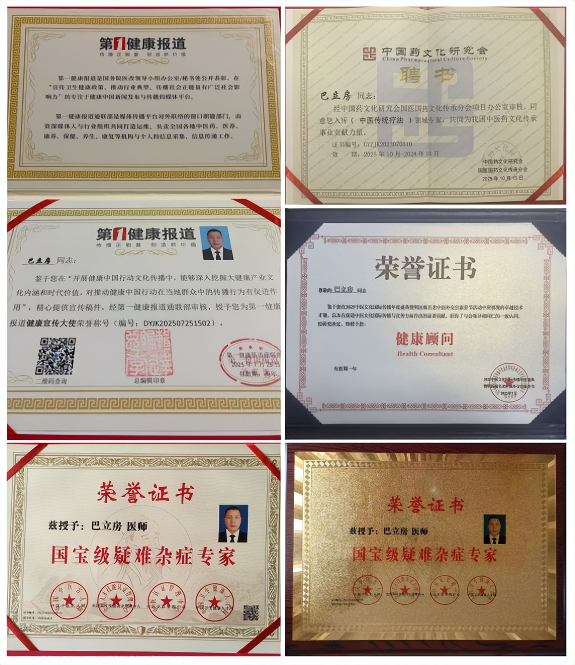 巴立房是中医药文化传播大使、中国第一健康报道健康宣传大使,被誉为“国宝级疑难杂症专家”,始终以“医惠民、文传薪”为己任,在临床诊疗中坚持以患者为中心,耐心诊断、精准施治,践行医者初心。