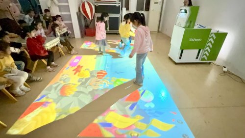 “哇!我的小鱼在游动!” 一位小朋友惊喜喊道。在AI绘画活动上,孩子们画下的小鱼、花朵、太阳、小动物,在通过高拍仪扫描上传后,瞬间“活”起来了。原本平面的画作变成投影在地面的3D立体动画,五彩斑斓的蝴蝶围绕着花朵翩翩起舞,可爱的小兔子蹦蹦跳跳地在草地间穿梭,小汽车在忙碌的马路上穿梭,孩子们迫不及待地走进这片光影世界,轻轻一跺脚,地面的投影画面还会随着脚步动来动去。