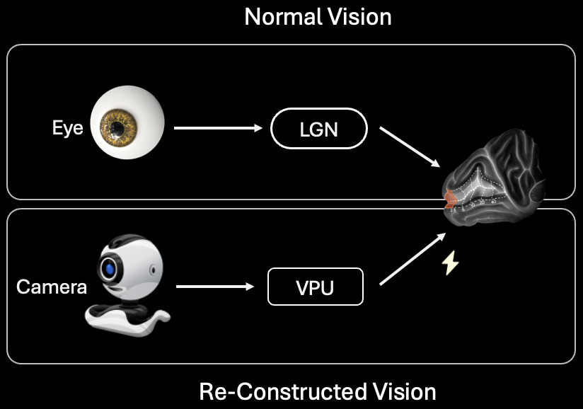 正常通路下,眼球捕捉外界图像,随后神经信号经由外侧膝状体到达初级视觉皮层;重建通路下,摄像头捕捉外界图像,信号经VPU处理生成时空刺激参数,通过电极阵列刺激初级视觉皮层。