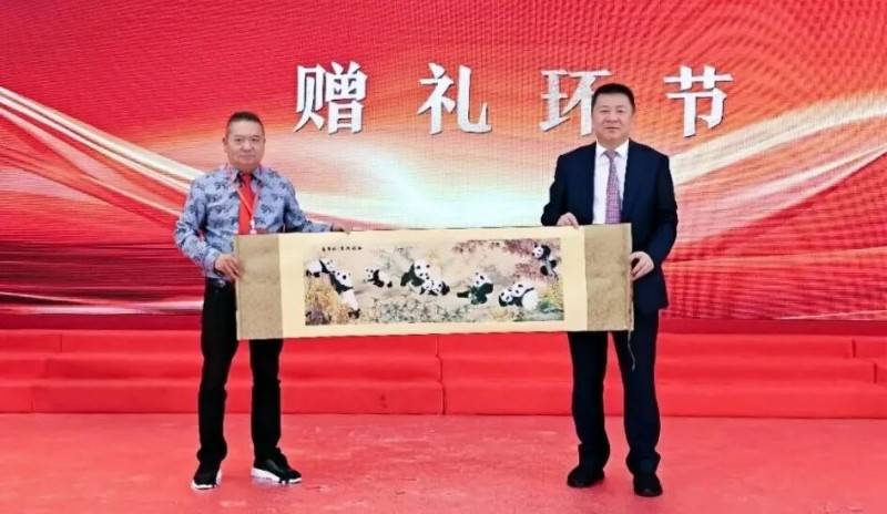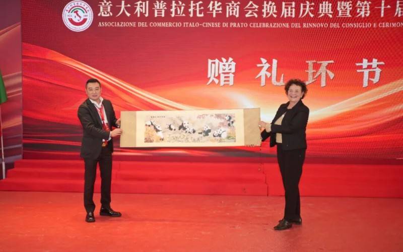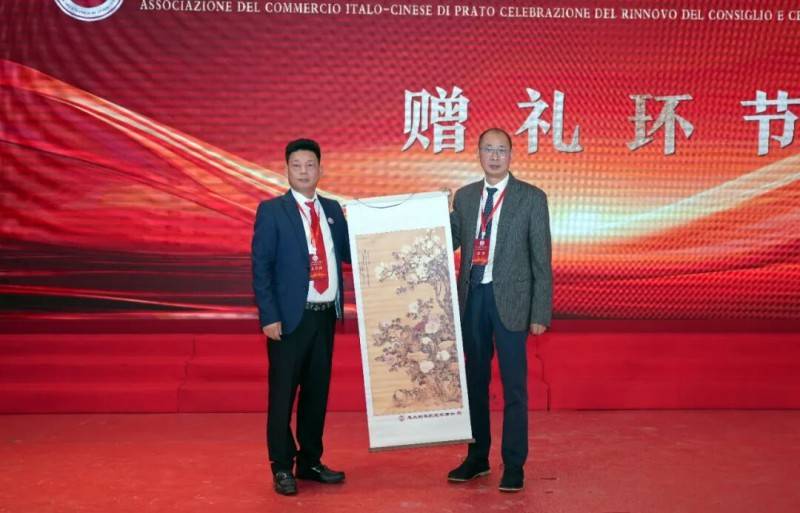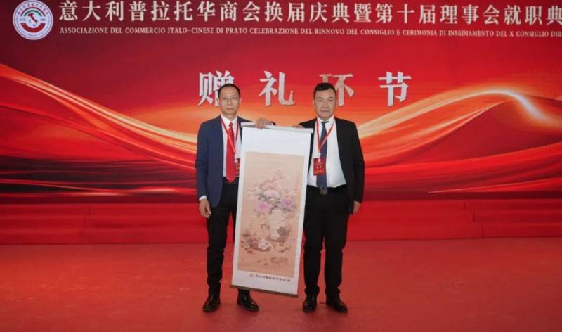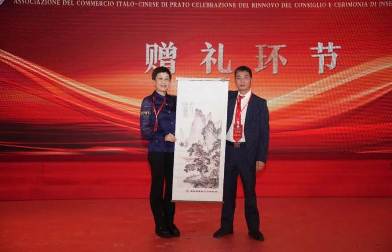 在大会期间,意大利普拉托华商会成员向主嘉宾赠送纪念品。