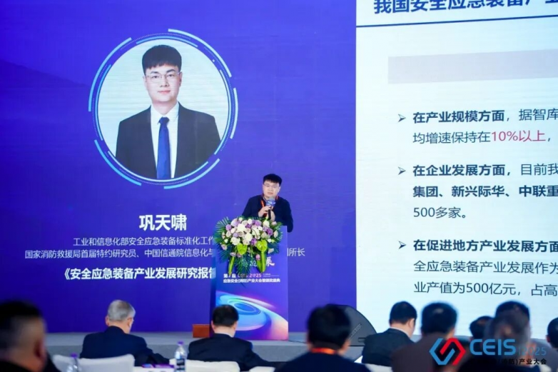 工业和信息化部安全应急装备标准化工作组秘书长、国家消防救援局首届特约研究员、中国信通院信息化与工业化融合研究所副所长巩天啸上台分享了《安全应急装备产业发展研究报告(2025年)》。报告聚焦 “十五五”,强调安全应急装备产业需着重于产业链的提升,以智能化、绿色化、融合化为方向,通过场景牵引、技术协同与平台搭建,推动技术创新落地应用。