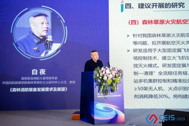 国务院森林防火督导组专家、中国消防救援学院森林草原防灭火研究中心主任、中国消防救援学院教授白夜分享了《森林消防装备发展需求及展望》专题报告。报告指出森林火灾频发现状,梳理了森林消防现代装备11类需求,点明监测预警不精准、决策指挥滞后等痛点,提出 “十五五” 需聚焦智能协同、精准灭火等关键技术研发。