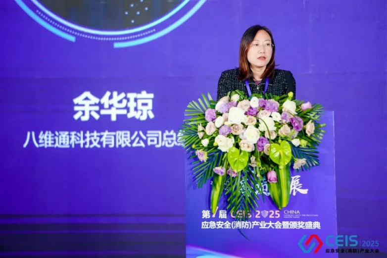 八维通科技有限公司总经理余华琼作为协办单位代表发表致辞,祝贺大会召开,同时指出人工智能+推动消防应急产业向智能、信息化转型是必然趋势,强调需破解行业共性难题,八维通将以空间智能赋能消防救援,愿与各方共建产业新生态,助力平安中国建设。
