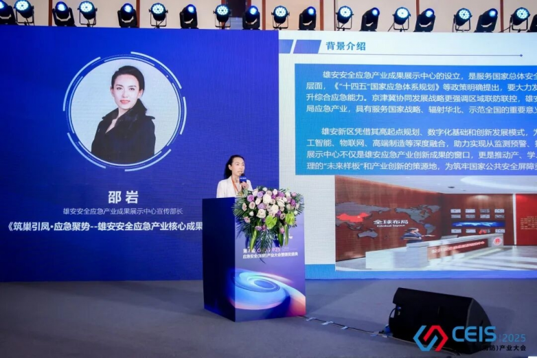 雄安安全应急产业成果展示中心宣传部长邵岩上台分享《筑巢引凤·应急聚势--雄安安全应急产业核心成果与机遇》,介绍了雄安安全应急产业布局,涵盖智慧城市与公共安全、实体产业、专项能力三大板块,强调展示中心的战略、数字化等四大赋能,诚邀企业携手发展。