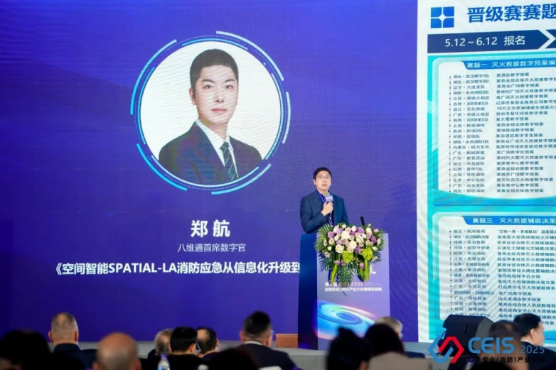 八维通首席数字官郑航上台分享了《空间智能Spatial-LA消防应急从信息化升级到空间智能体》,侧重空间智能在消防应急的应用,强调需融合现有信息化系统,依托消防数字孪生大赛成果,构建数字底座与智能体平台,推动消防应急向空间智能升级。