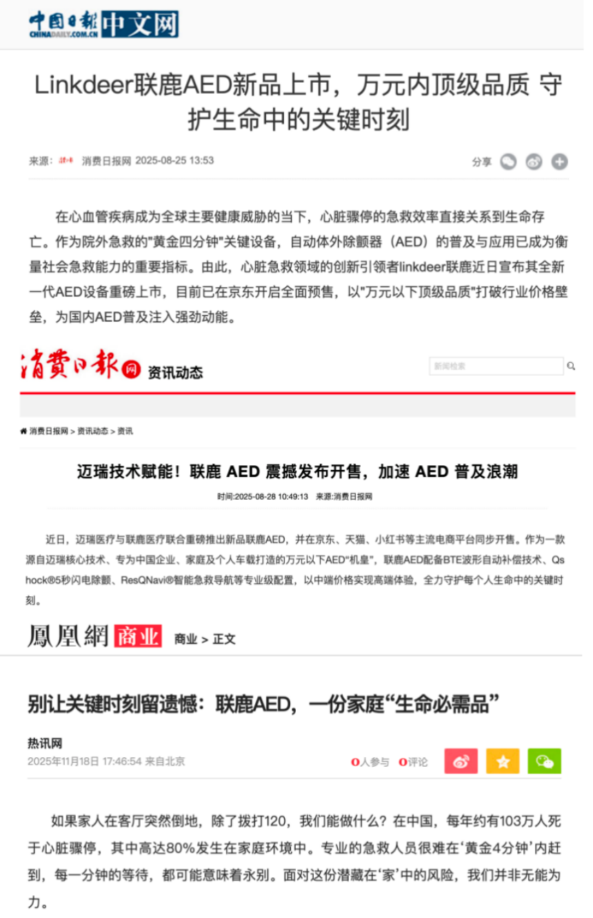在AED逐渐进入大众视野的今天,深圳联鹿医疗科技有限公司旗下的联鹿AED品牌,凭借其出色的产品性能和完善的服务体系,获得了上百家权威媒体聚焦。例如,中国日报网、中国网等发布的《Linkdeer联鹿AED新品上市,万元内顶级品质,守护生命中的关键时刻!》;中国发展网、消费日报、中华网等刊登的《迈瑞技术赋能!联鹿 AED 震撼发布开售,加速 AED 普及浪潮》;凤凰网、腾讯、搜狐等报道的《联鹿AED,一份家庭“生命必需品”》等文章,从不同角度深入解读了联鹿AED在产品技术、服务保障、市场表现等方面的突出优势,让更多消费者认识到这个致力于普及急救设备的民族品牌。作为普通消费者,我们或许会疑惑,究竟哪些人群最需要配置AED?选择AED时应该关注哪些核心要素?联鹿AED又凭借什么赢得了市场的认可?
