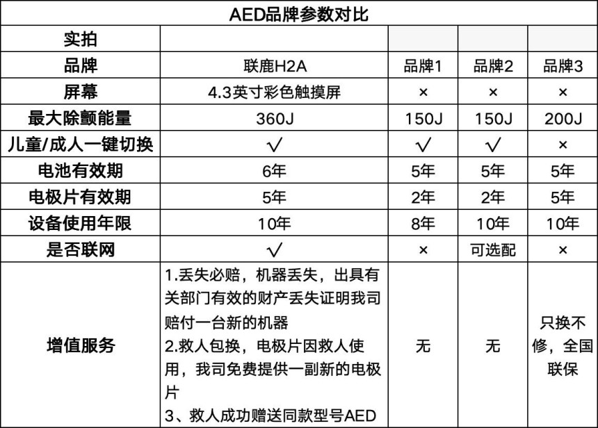 为了让消费者更直观地了解联鹿AED的产品优势,我们将联鹿H2A与市场上主流的三个品牌进行了全面对比,从屏幕配置、除颤能量、耗材有效期、联网功能到增值服务等多个维度,清晰展现了各品牌之间的差异。