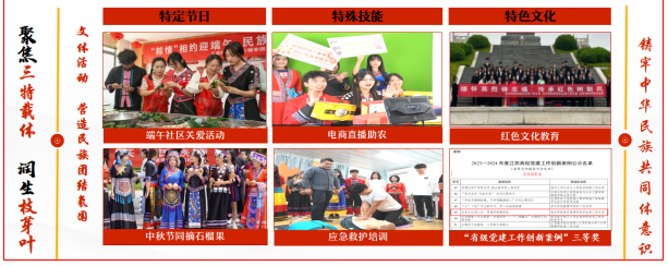 工作室以文化育心、以节日聚情、以技能赋能,通过“三特”载体将民族团结融入校园生活细处,让情感共鸣扎根、文化认同生长、实践能力跃升,共筑“宿院一家亲”的温暖共同体。一是紧扣特定节日节气(如中秋、国庆),精心组织“中华民族一家亲”主题活动、文艺汇演,使节日成为增进情感、深化认同的契机,让少数民族学生一起过节,一起同欢,一起共悲,让学生不仅在宿院有个“家”,更有专属“家”的感觉。二是打造特色文化品牌,持续做优“民族文化节”、“红色文化润心田”“廉政文化长廊讲解”等活动,让民族团结理念融入学生日常,让学生生在“红旗”下,长在“清风”里,在民族团结的氛围中逐梦“宿”愿 。三是发挥特长专业优势,为少数民族学生量身定制如电商直播、应急救护、普法宣传等技能培训,提升其综合素质与实践能力,让少数民族学生不仅在理论上学的“精”,更在实践上练得“强”。
