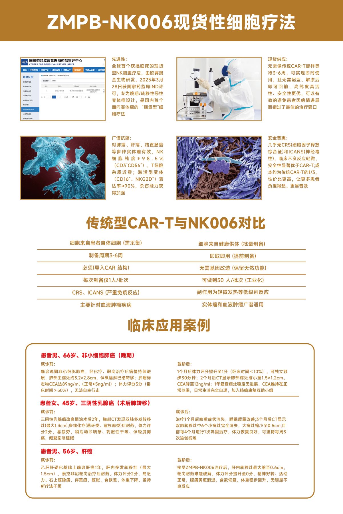 如今,NK细胞疗法已成为继CAR-T之后的免疫治疗新风口,而国内首创的现货型新药ZMPB-NK006,更将这一疗法推向“普惠时代”,为晚期实体瘤患者带来新希望。