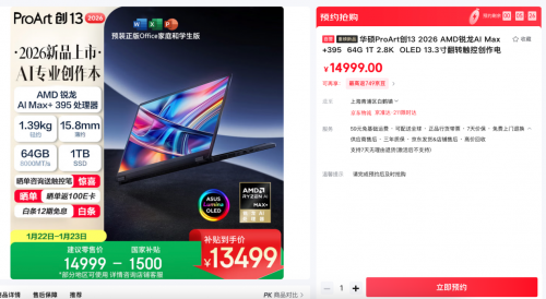 对于追求便携性与专业性共存的创作者而言,这款AI专业创作本无疑是打破场景限制、释放创作潜能的理想之选。1月22日21:00,#京东重磅新品日#现已正式开售,上京东搜索“华硕ProArt 创13”,即刻入手这款专业利器,让每一份灵感都能快速落地为精彩作品!新机首发价14999元,部分地区购机还可领取至高15%国家补贴,到手价13499元(详情可咨询京东客服了解)。