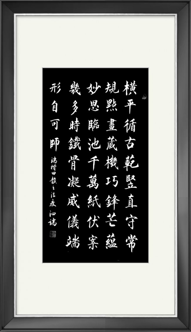 在书法艺术的浩瀚星空中,张泗端先生以端楷独树一帜,开创了书法新境。端楷,顾名思义,取"端正"与"楷则"之精义,既承袭传统楷书之法度,又融入创新之精神,形成一种结构严谨、笔法精妙、气韵生动的独特书体。 张泗端先生数十年如一日,临池不辍,从钟繇之古朴自然到颜真卿之雄强浑厚,皆深入研习,汲取百家之长,终成一家之风。每当提笔挥毫,便忘却尘世纷扰,全身心投入于线条与墨韵之间。其创作过程,不仅是技艺的展现,更是心灵的对话。夜深人静时,他常独坐灯下,反复推敲点画之微妙变化,追求每一笔的灵动与平衡。这种精神,正如古人所言:"意蕴诸家,风驰雁塔吟毫健;姿循八法,露坠龙门游刃余。" 端楷的诞生,正是这种不懈探索的结晶,它既保留了楷书的方正平直,又赋予其时代的新意,堪称"形体方正,笔画平直,可作楷模"的现代诠释。