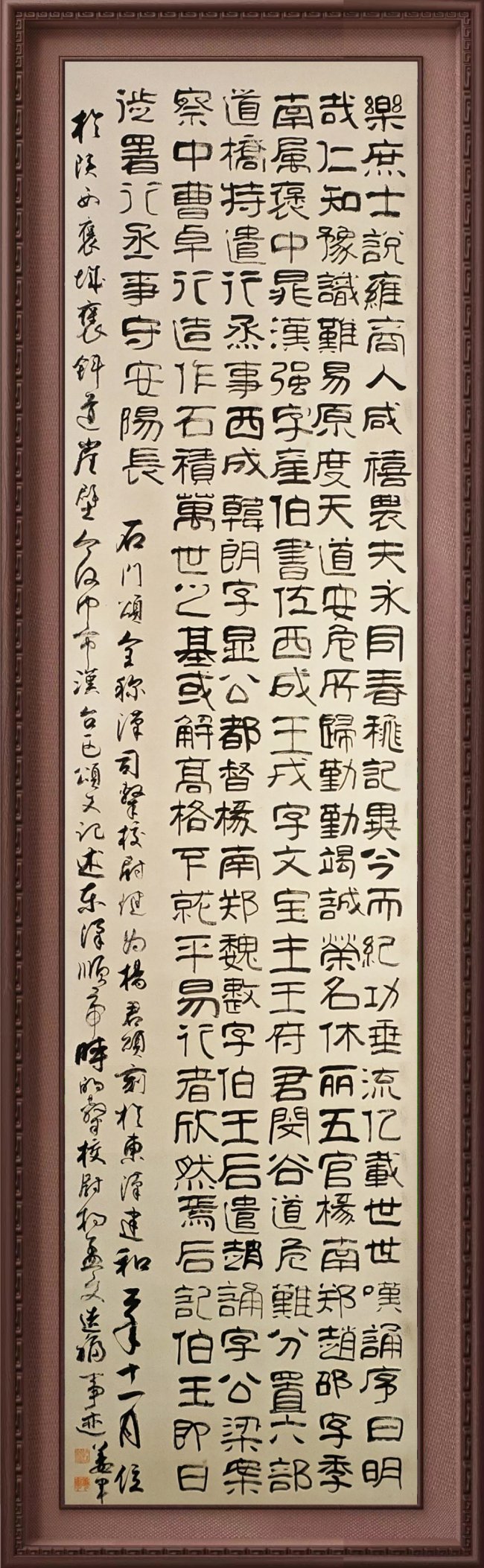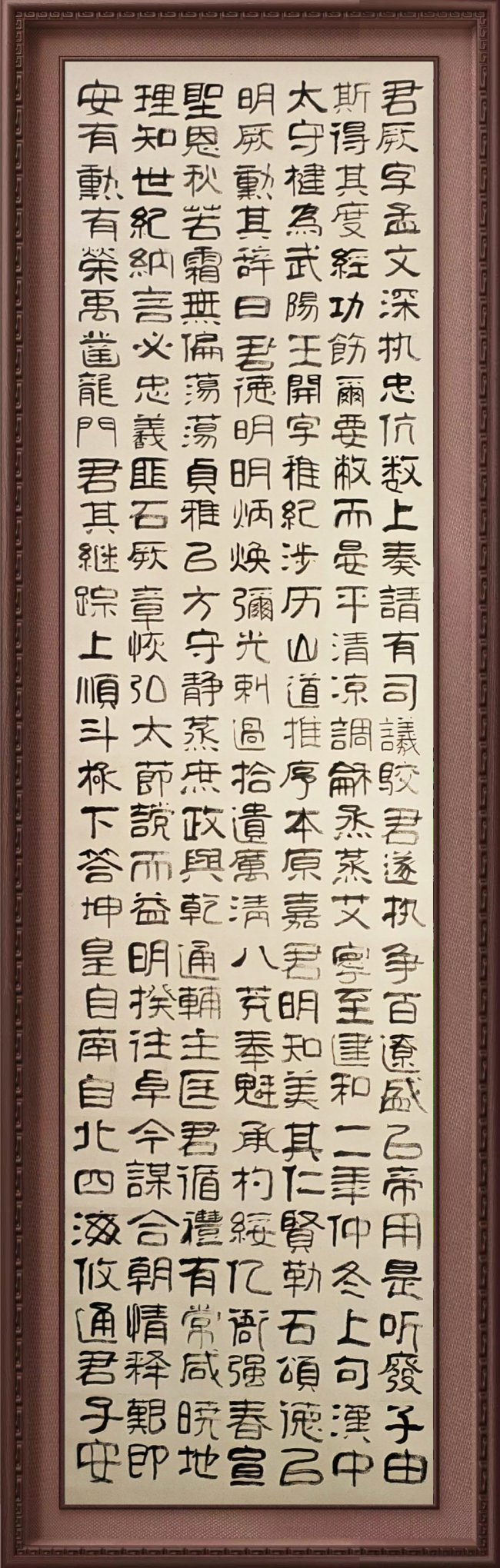 其用笔沉雄斩截,起收如拳术蓄势发劲,顿挫间藏攻防转换之妙;行草流转酣畅,章法开合似身法进退,气脉贯通如内家拳调息连绵,无浮滑虚飘之态。小楷端凝如站桩守中,隶篆朴厚若古阵立势,刚柔相济、方圆并用,恰合武术“静如岳、动如涛”的精髓。