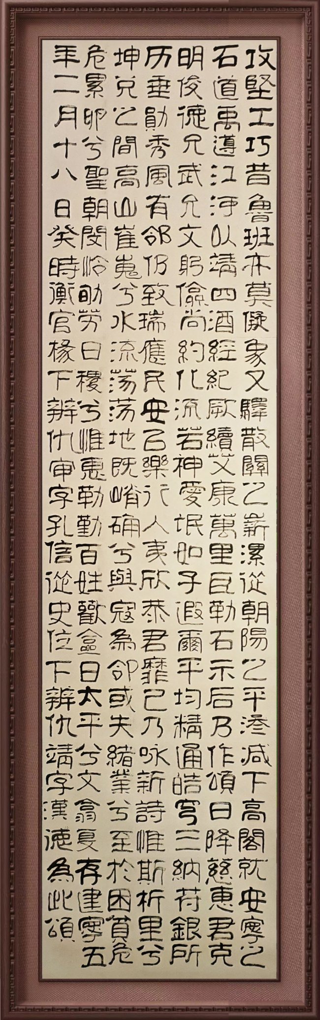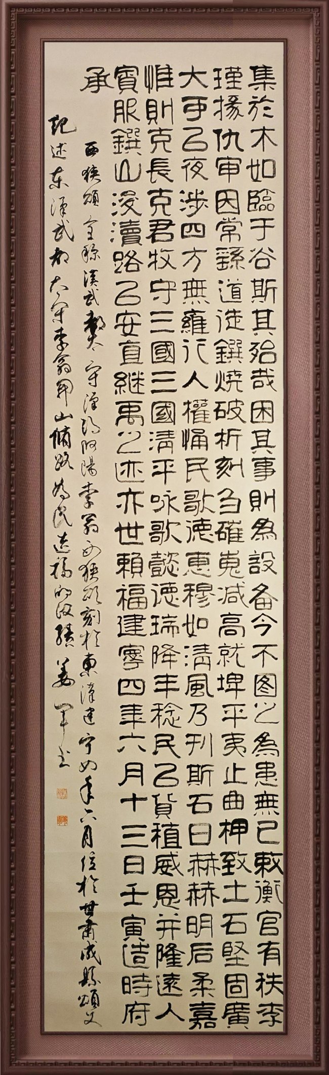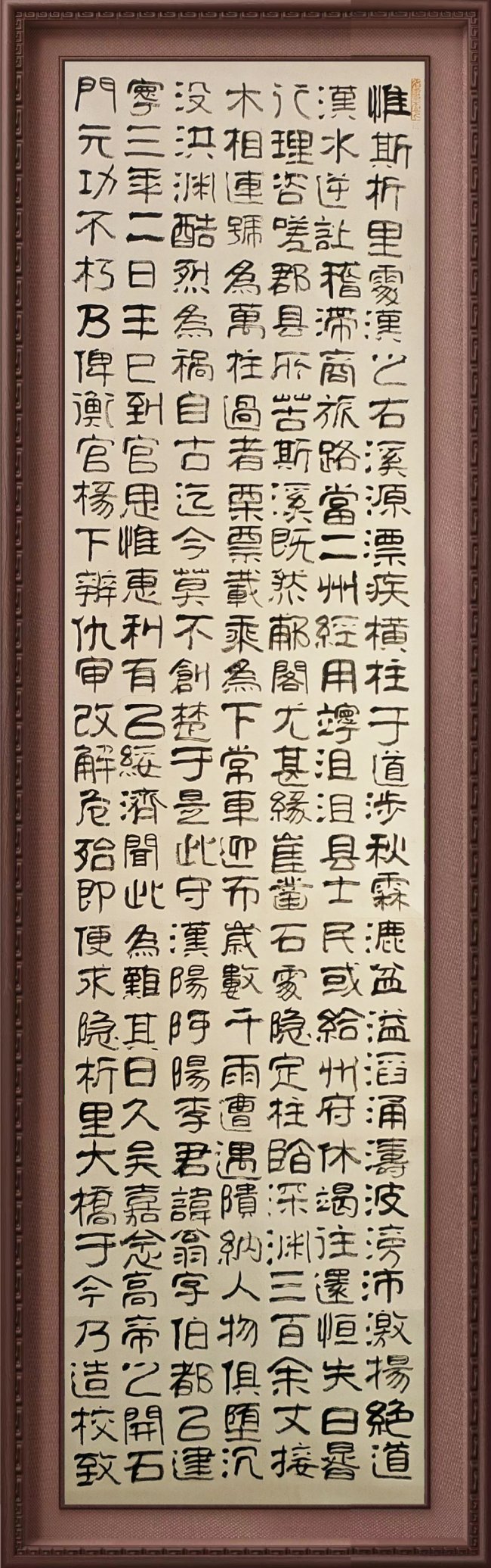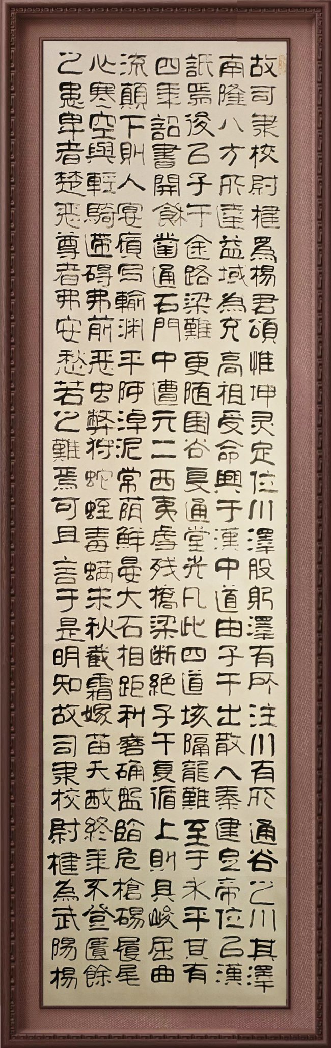 书作既有《西狭颂》的金石骨力,又具武者的爽利气度,字里行间可见“笔为剑、墨为锋”的文武相融之境,既守传统法度,又以武韵赋能笔墨,形质与神采兼备,尽显中华文武同宗的文化底蕴。从书体上看,他的楷书、隶书,特别是小楷,个性风格渐显。行草书则一气呵成,笔酣墨畅,大气淋漓,展现出斩钉截铁的气势。其作品整体结构端庄,行笔大气,笔法干练,中宫严谨,结构舒展,用笔凝重,有从险绝回归平整的奇趣。