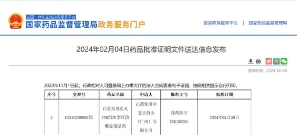 2024年1月30日,中国替奈普酶(rhTNK-tPA)正式获得国家药品监督管理局(NMPA)批准,用于发病后4.5小时内急性缺血性脑卒中(AIS)患者的静脉溶栓治疗,此为同产品在中国的首次获批。药物的获批不仅为临床提供了新的规范化治疗选择也标志着我国在卒中溶栓领域实现了自主创新的重要突破。