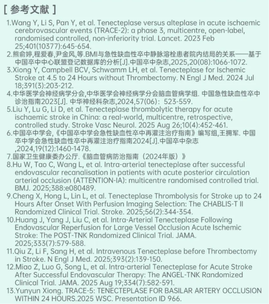 但获批并非终点。过去两年中,围绕中国替奈普酶(rhTNK-tPA)在不同卒中人群、不同时间窗及多种临床场景中的应用价值,多项研究持续推进循证证据不断积累,并逐步转化为指南推荐与医保覆盖。从循证深化到临床可及,中国替奈普酶(rhTNK-tPA)正以持续研究回应中国卒中患者的真实治疗需求。