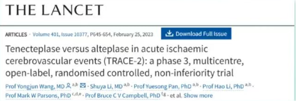 TRACE-Ⅱ研究为中国患者提供关键证据1,首次将中国脑血管病注册研究刊登世界顶刊(Lancet)。研究指出,对于发病4.5 h内的AIS患者,中国替奈普酶是阿替普酶的合理替代选择。