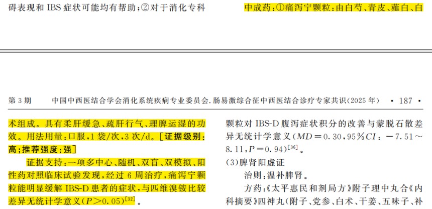 痛泻宁颗粒是目前治疗 IBS-D 循证最多、质量最高的中成药,因其疗效确切、安全性高、经济性好等优势显著,先后获10余项国际国内指南/共识推荐,且是中华医学会《2020年中国肠易激综合征专家共识意见》唯一推荐及《肠易激综合征中西医结合诊疗专家共识(2025年)》唯一高证据质量、强推荐的中成药。