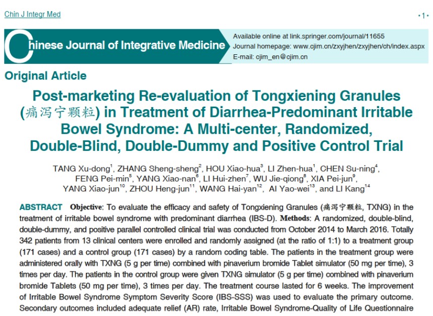 痛泻宁颗粒已在临床应用10余年,积累了大量的临床研究数据与应用经验。20余项高质量随机对照(RCT)临床研究显示:痛泻宁颗粒能多环节、多靶点有效改善IBS-D患者腹痛、腹泻、腹胀、腹部不适等整体症状,且可明显延长复发或加重的时间,有效降低复发率。一项痛泻宁颗粒治疗IBS-D与得舒特(匹维溴铵片)进行的342例的多中心、大样本RCT临床研究证明,痛泻宁颗粒治疗IBS-D整体疗效与得舒特(匹维溴铵片,临床一线阳性化药)相当或更优,痛泻宁颗粒起效更快,对重症IBS-D和女性患者疗效更好,复发率更低;该研究成果已在国际权威期刊《Chinese Journal of Integrative Medicine》(IF 2.9)发表。另一项纳入480例患者的多中心RCT临床研究也显示,痛泻宁颗粒治疗IBS-D安全、有效,疗效显著优于安慰剂组,且用药期间无明显不良反应。