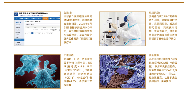 目前,NK006已覆盖多种临床适用场景,包括化疗后免疫修复、术后残留病灶清除、传统治疗耐药后的挽救治疗、联合治疗增效等。它既能单药发挥肿瘤杀伤作用,也能与PD-1抗体、靶向药、放疗等治疗手段联合使用,形成“1+1>2”的协同治疗效果,进一步提升治疗成功率。