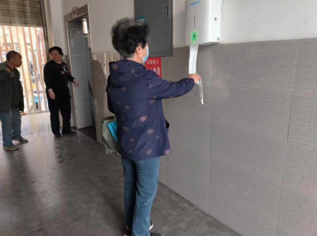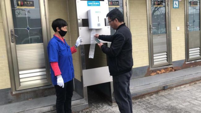 (图片 1:市民在市政公厕轻松扫码使用千纸盒智能出纸机,操作界面简洁无广告,3 秒出纸一气呵成)
