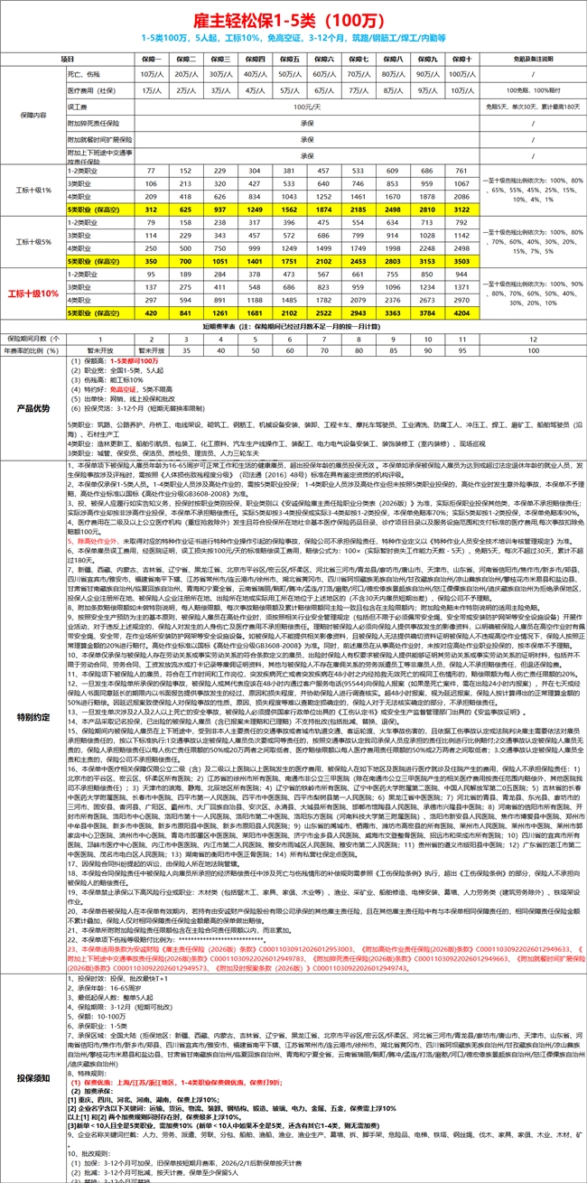 今天,我给大家推荐一款真正懂高危行业的雇主险——【雇主轻松保1-5类(2026版)】。它专为解决“高空无证、地域限制、伤残赔付低”三大痛点而来。