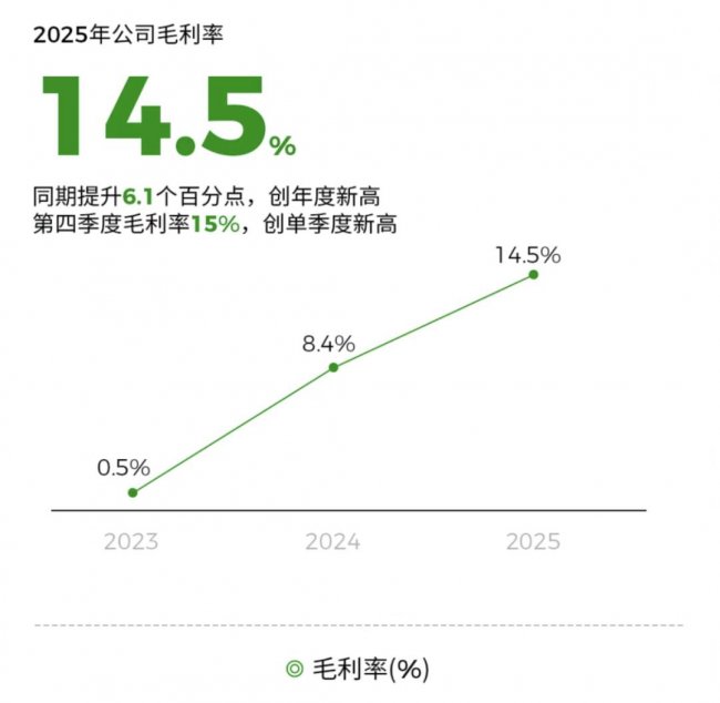 事实上,近日零跑汽车股价震荡上涨,不断走强,既是国际宏观局势利好的催化,更是企业自身经营质变的价值兑现。近期零跑汽车发布的2025年财报数据显示,零跑汽车2025年全年营收647.32亿元,同比翻番;归母净利润5.38亿元,年度首次盈利;毛利率攀升至14.54%的历史新高;更手握378.8亿元现金储备,相较2024年末的244.6亿元,增长近55%。